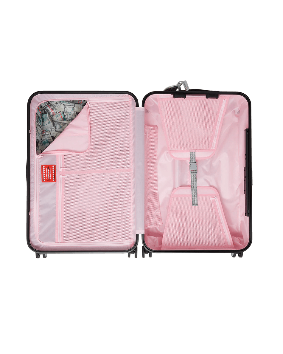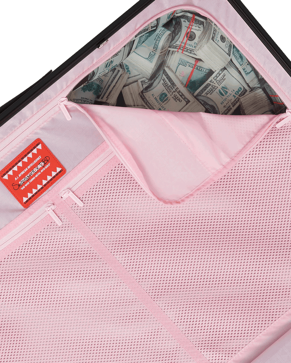 sprayground A.i. Inteligența Africană Energie Elegantă Sharkitecture Bagaj De Dimensiuni Complete Măsoară 29,5 Inci și Combină Calitate, Funcționalitate și Design. Sculptura Sa Patentată în Formă De Rechin Adaugă O Notă Unică, în Timp Ce Interiorul Se Mândrește Cu O Căptușeală Din Satin Cu Imprimeu De Bani și Buzunare Organizatoare Din Plasă Pentru O Organizare Perfectă.